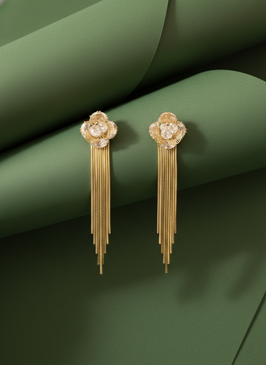 Floral gold-tone earrings with cascading chains, designed for graceful statement looks.