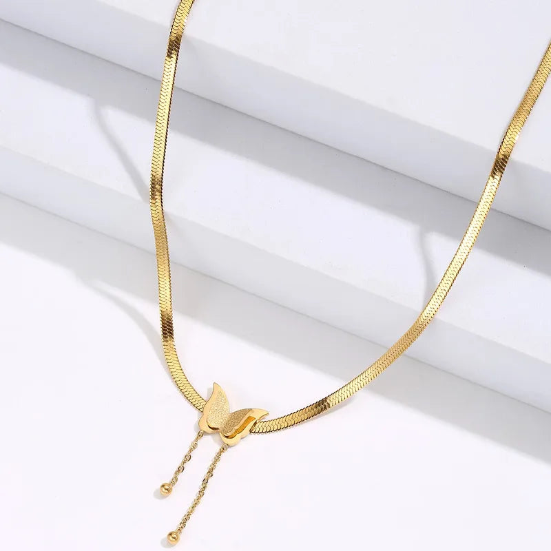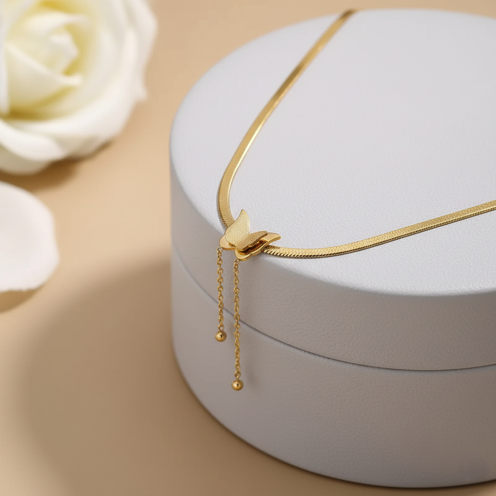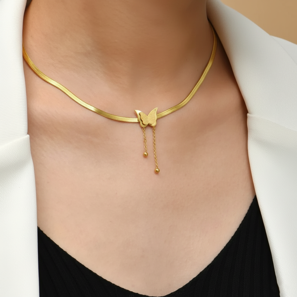 Graceful and radiant, the Veloura Butterfly Necklace captures the essence of transformation and elegance. Crafted in polished gold, it features a delicately sculpted butterfly pendant with dual hanging chains that add movement and charm. Perfectly balanced between bold and feminine, Veloura is a symbol of lightness, freedom, and timeless beauty — designed for those who embrace change with grace.
